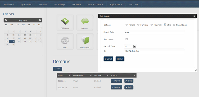 Vad är nu detta undrar du?1. Vår nya kontrollpanel börjar bli klar och beräknas läggas in första veckan i juni. Största ändringen är full DNS kontroll över domäner, dvs du kan lägga till många domäner och hantera dessa obegränsat via vår nya DNS manager. Panelen är gjort så den ska vara tydlig, lättanvänd och den innehåller senaste teknikerna som jquery/ajax. Nedan bifogar vi en bild på beta versionen av vår nya kontrollpanel.