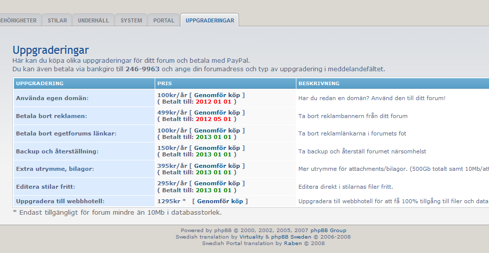 Angående uppgraderingar och betalningar för dessa! Nu kan man se när ens betalning för olika uppgraderingar går ut, datum i rött innebär att förnyelse behövs och grönt att man inte behöver förnya ännu. Man går till Uppgraderingsfliken i Administrationspanelen enligt figuren nedan.