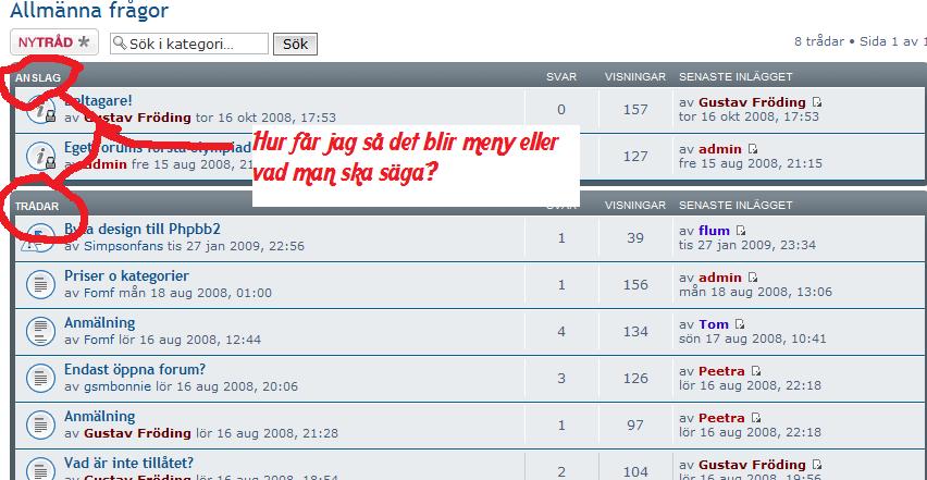 Det du visar i bilden däremot är anslag. Ett anslag hamnar överst under en kategori oavsett hur många trådar som skrivs. Ett anslag skapar du genom att skapa ny tråd (nytt ämne), skriv ditt meddelande, välj alternativet gör till anslag.